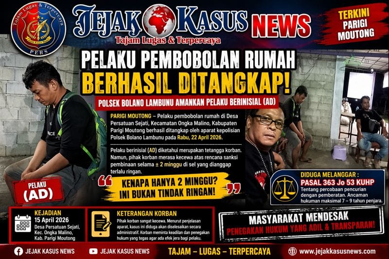 Parigi Moutong,Jejak-kasusnews.web.id – Pelaku pembobolan rumah di Desa Persatuan Sejati, Kecamatan Ongka Malino, Kabupaten Parigi Moutong, yang berinisial (AD) akhirnya berhasil ditangkap oleh aparat kepolisian dari Polsek Bolano Lambunu pada Rabu, 22 April 2026.